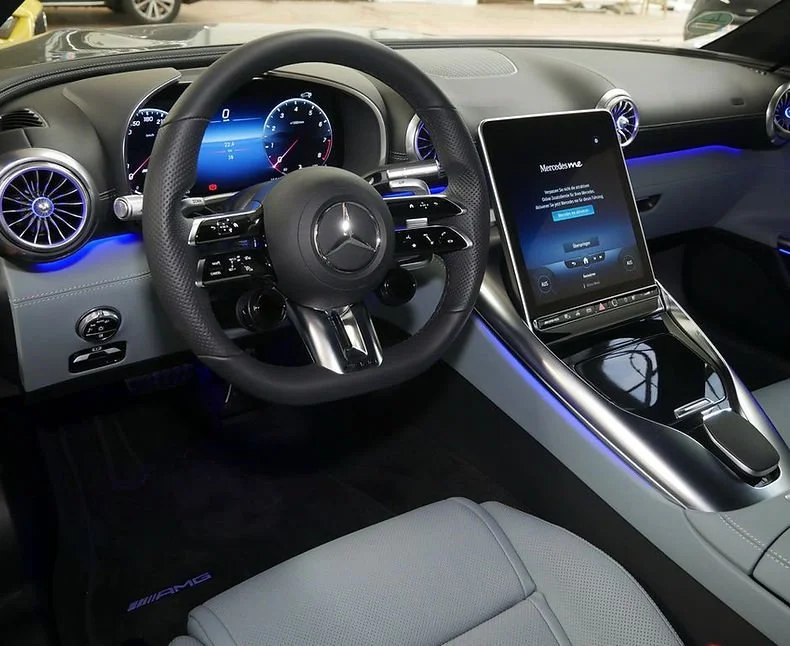 Intérieur d'une voiture Mercedes-Benz avec tableau de bord numérique, volant avec logo Mercedes, écran central tactile, ambient lumineux bleu et éléments en finition noir brillant.